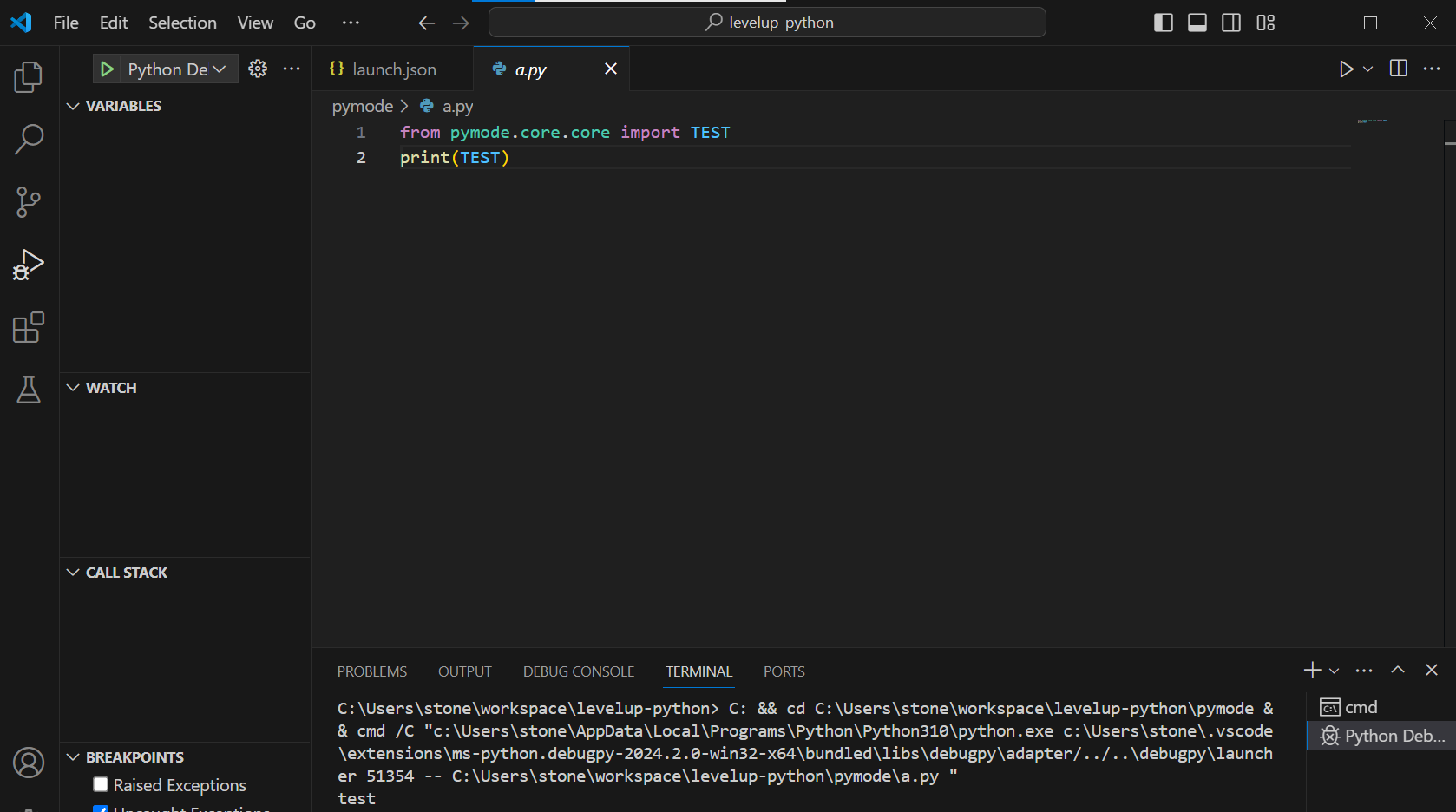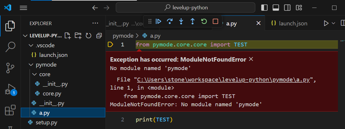 이러한 에러를 방지하기 위해서는 launch.json 파일에 PYTHONPATH 설정을 하면 됨
